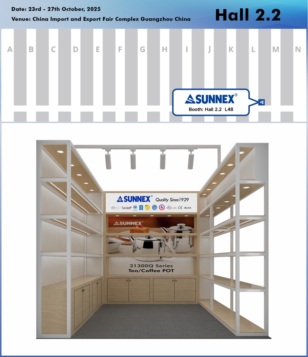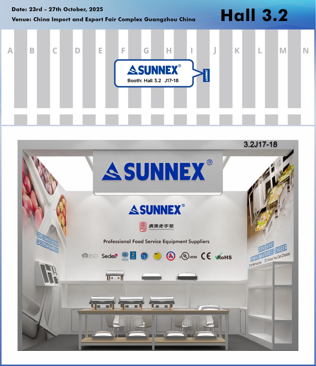 กว่างโจว จีน – ตุลาคม 2568 – SUNNEX Century (Shenzhen) Ltd. ผู้ผลิตชั้นนำด้านผลิตภัณฑ์บุฟเฟ่ต์ระดับพรีเมียม จานอุ่น ตู้เครื่องดื่ม และเครื่องใช้ในครัวเรือน มีความยินดีที่จะเชิญผู้ซื้อ สื่อ และผู้เชี่ยวชาญในอุตสาหกรรมจากต่างประเทศมาเยี่ยมชมบูธของเราที่งานแสดงสินค้านำเข้าและส่งออกของจีนครั้งที่ 138 (งานแคนตันแฟร์)