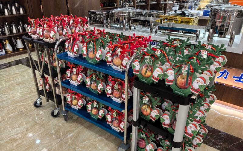 ร้องเพลง “เราขออวยพรให้คุณสุขสันต์วันคริสต์มาส เราหวังว่าคุณจะสุขสันต์วันคริสต์มาส….” บรรจุแอปเปิ้ลแดงลูกใหญ่ที่น่ารักเข้าด้วยกัน สันติภาพ แล้วซานตาคลอสก็ส่งแอปเปิ้ลอันสงบสุขมาให้เราสองลูกต่อไม้เท้าหนึ่งอัน ความสุขทวีคูณ ว้าว หวานฉ่ำเหมือนครอบครัวใหญ่